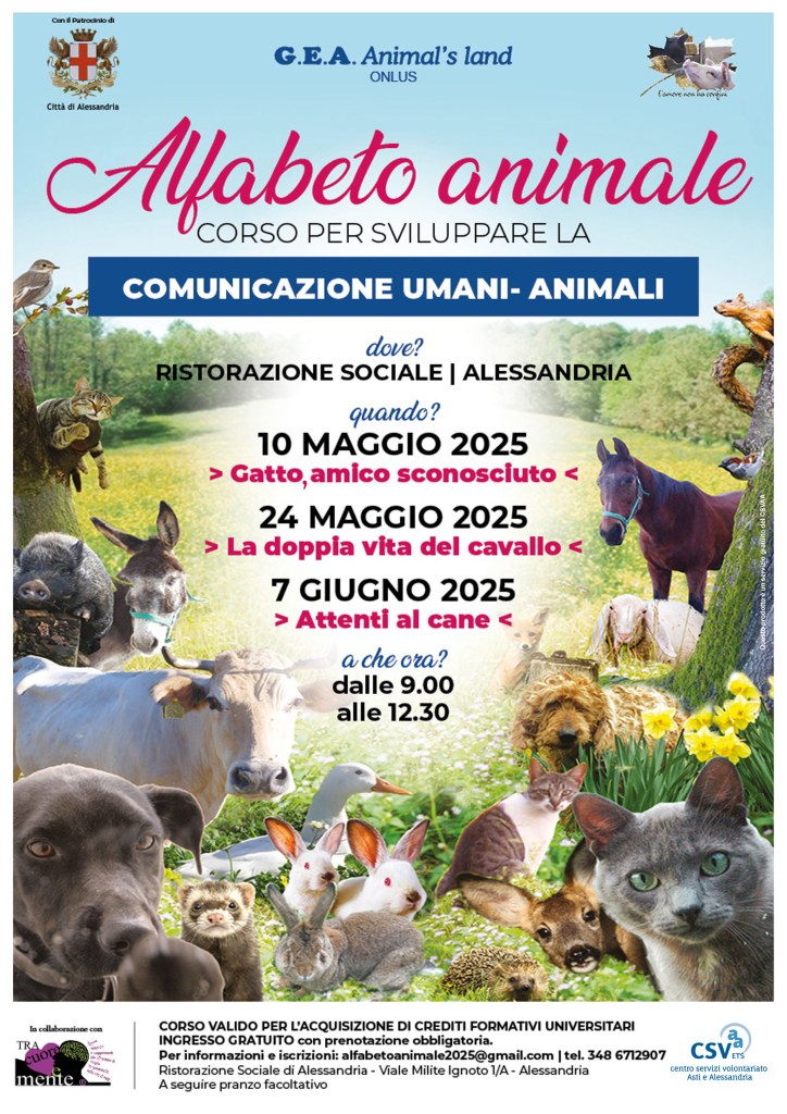 Collaboro con l’associazione GEA Animals’ Land di Novi Ligure, con cui organizzo incontri volti a sensibilizzare il grande pubblico su tematiche legate alla gestione e alla relazione con gli animali, in particolare quelli domestici.